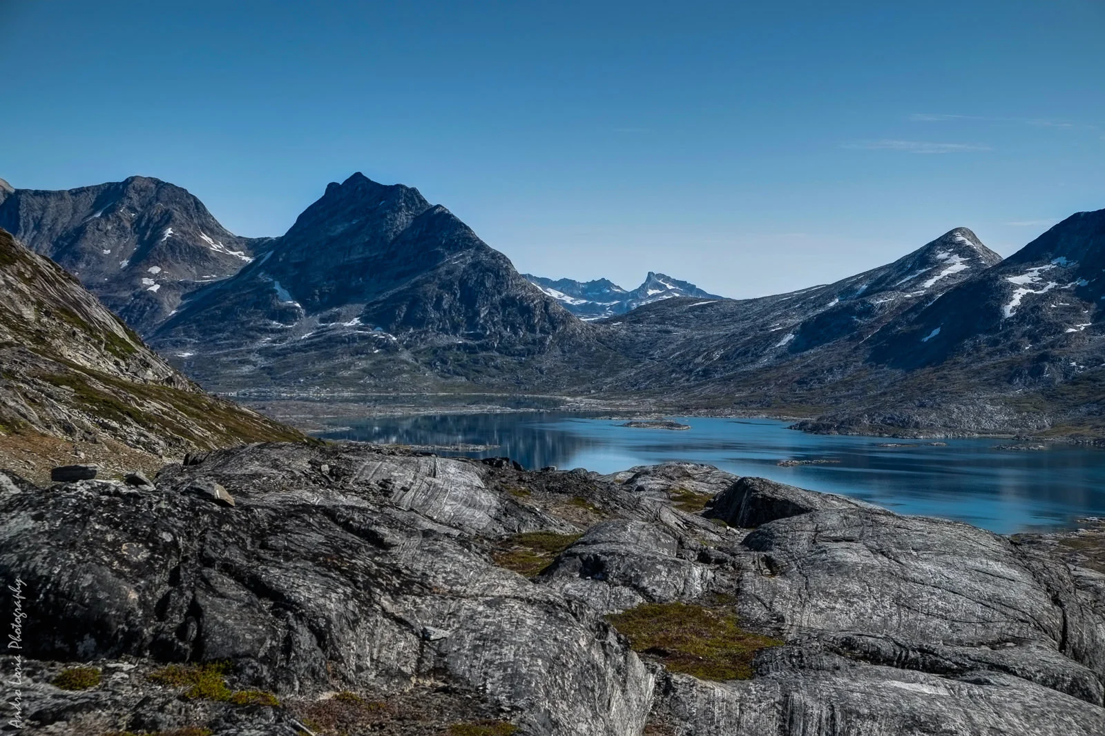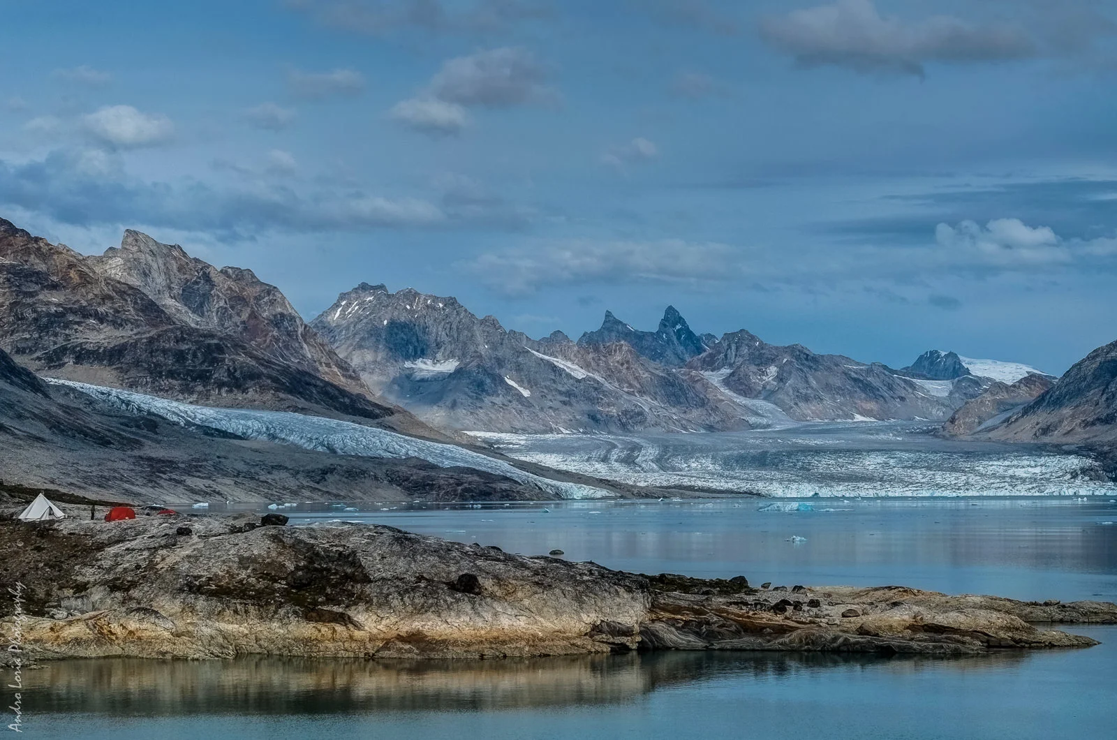 Our first camp was at the Karale fjord, a few hours motoboat ride from Kulusuk. The day we arrived the weather was rather grey, but gradually changed to sunny with blue skies and stayed so for more than a week. The granite mountain peaks of East Greenland are about 1000-1500m high and though they look deceptively young they are actually very old having been protected from erosion by an ice cap that is retreating from the coast line now.