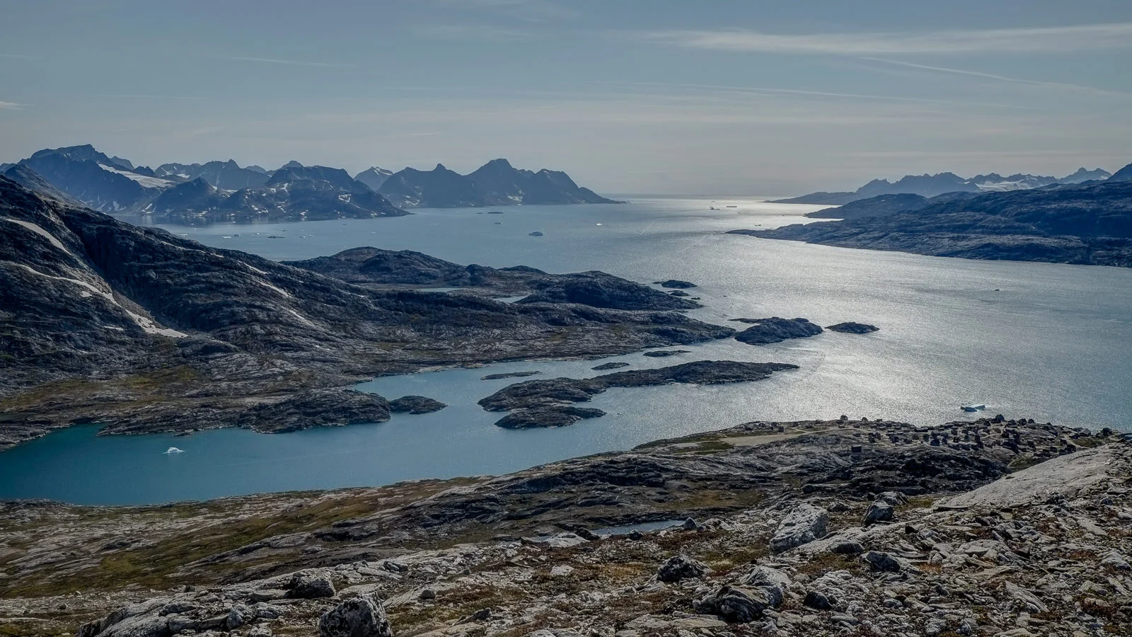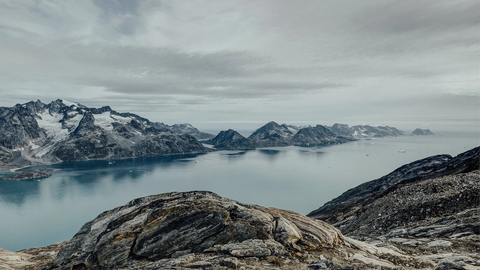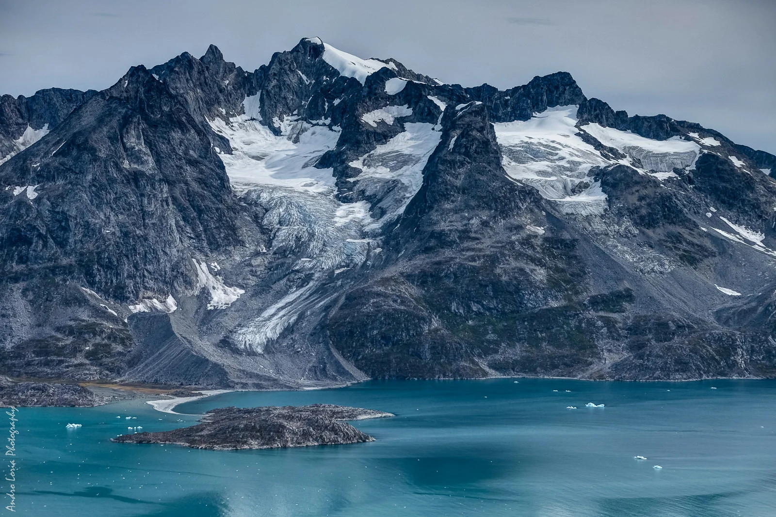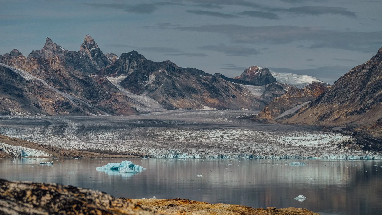the turtle-like granite rock comes out of the glacier like a giant prehistoric animal awaken after an ice-age. Image taken at Karale fjord, East Greenland.