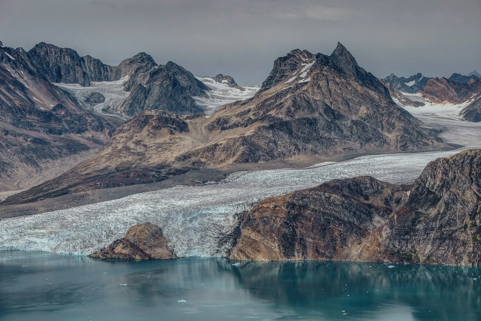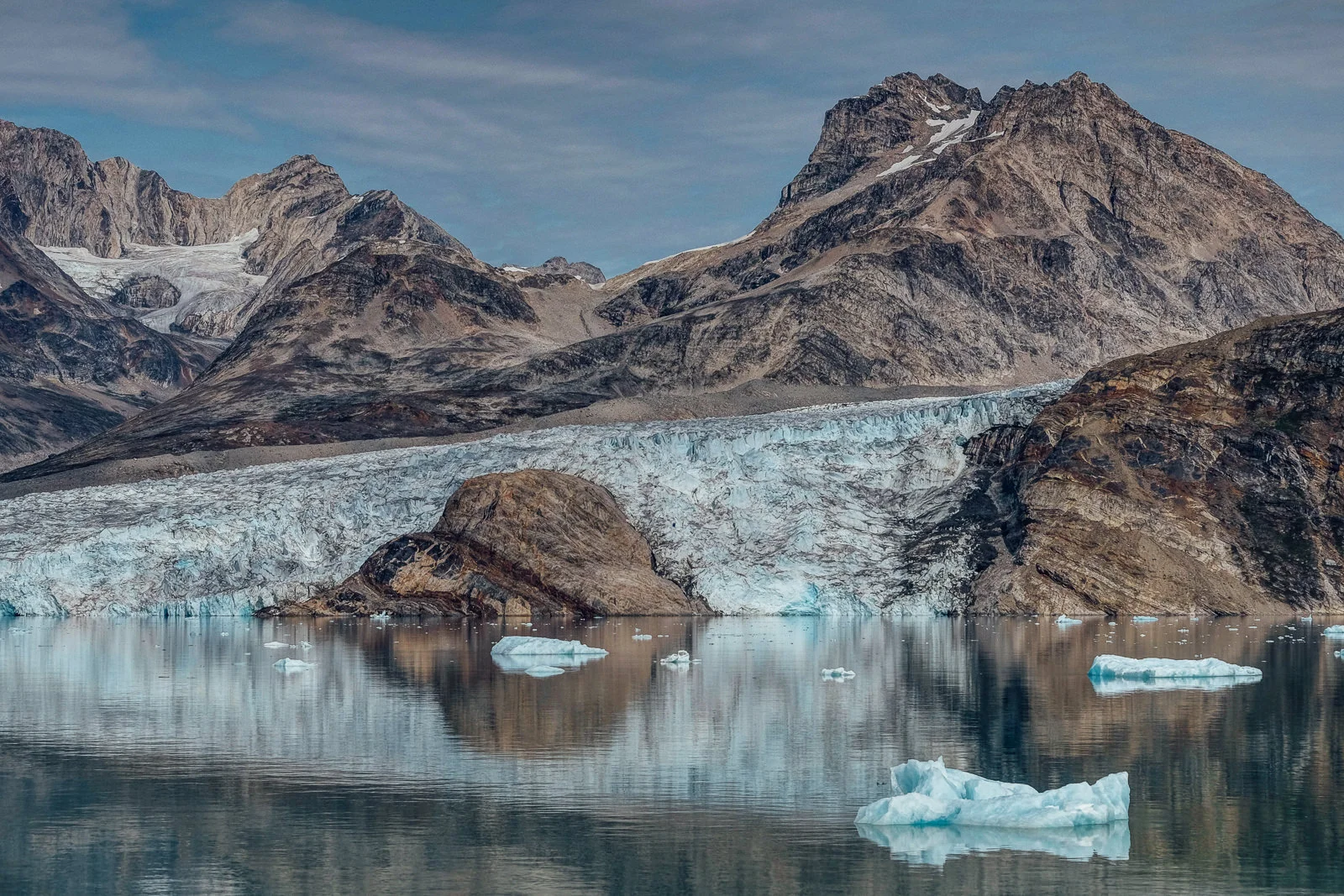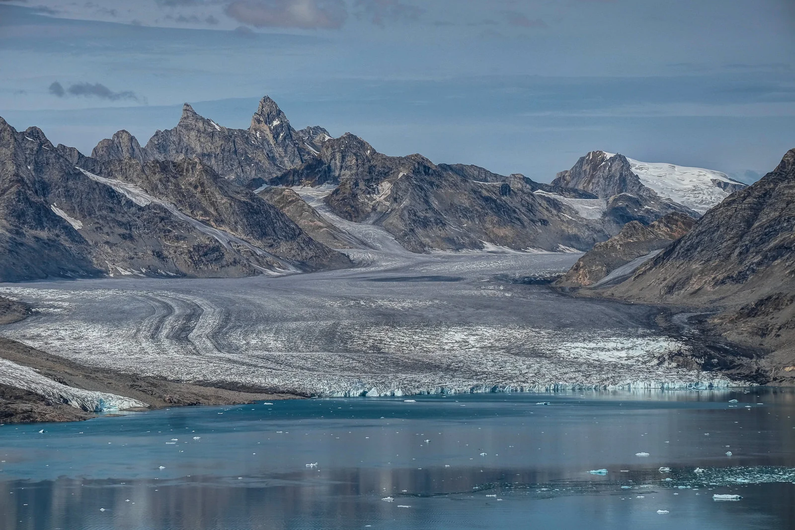 Knud Rasmussen glacier, the magnificent glacier flows into icy waters of Karale fjord, East Greenland. The glacier is named after a similarly magnificent man, Danish polar explorer Knud Rasmussen