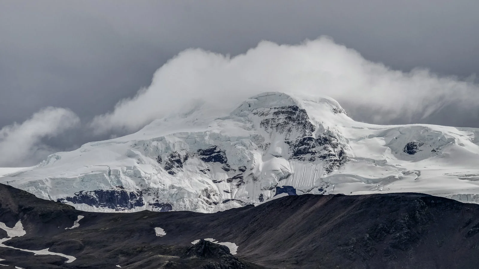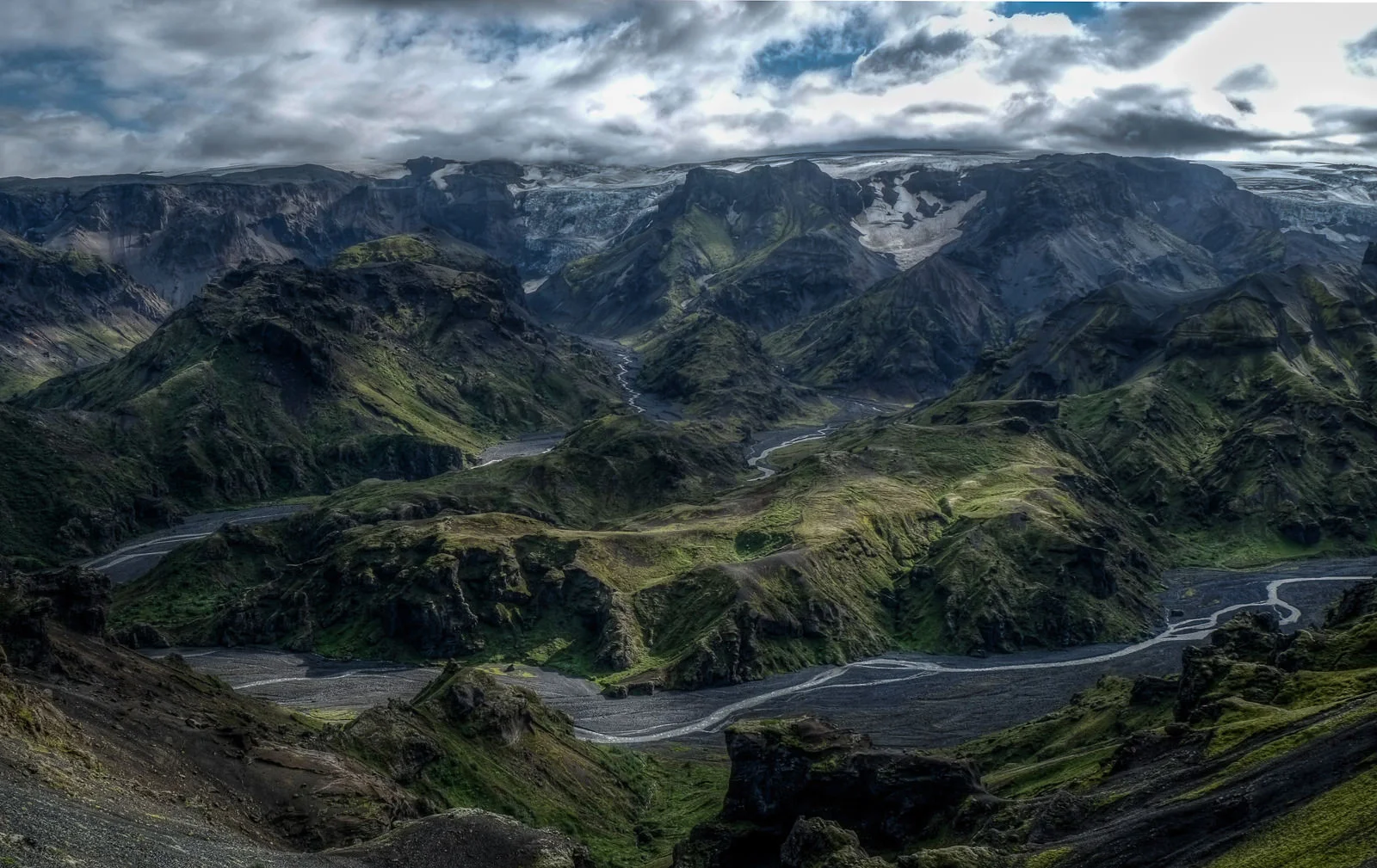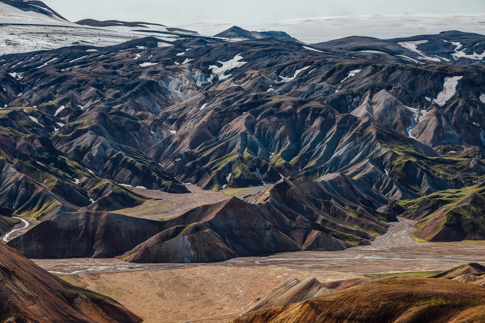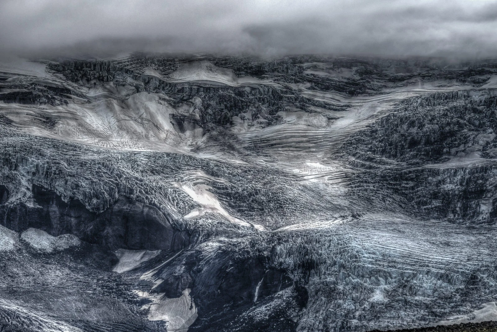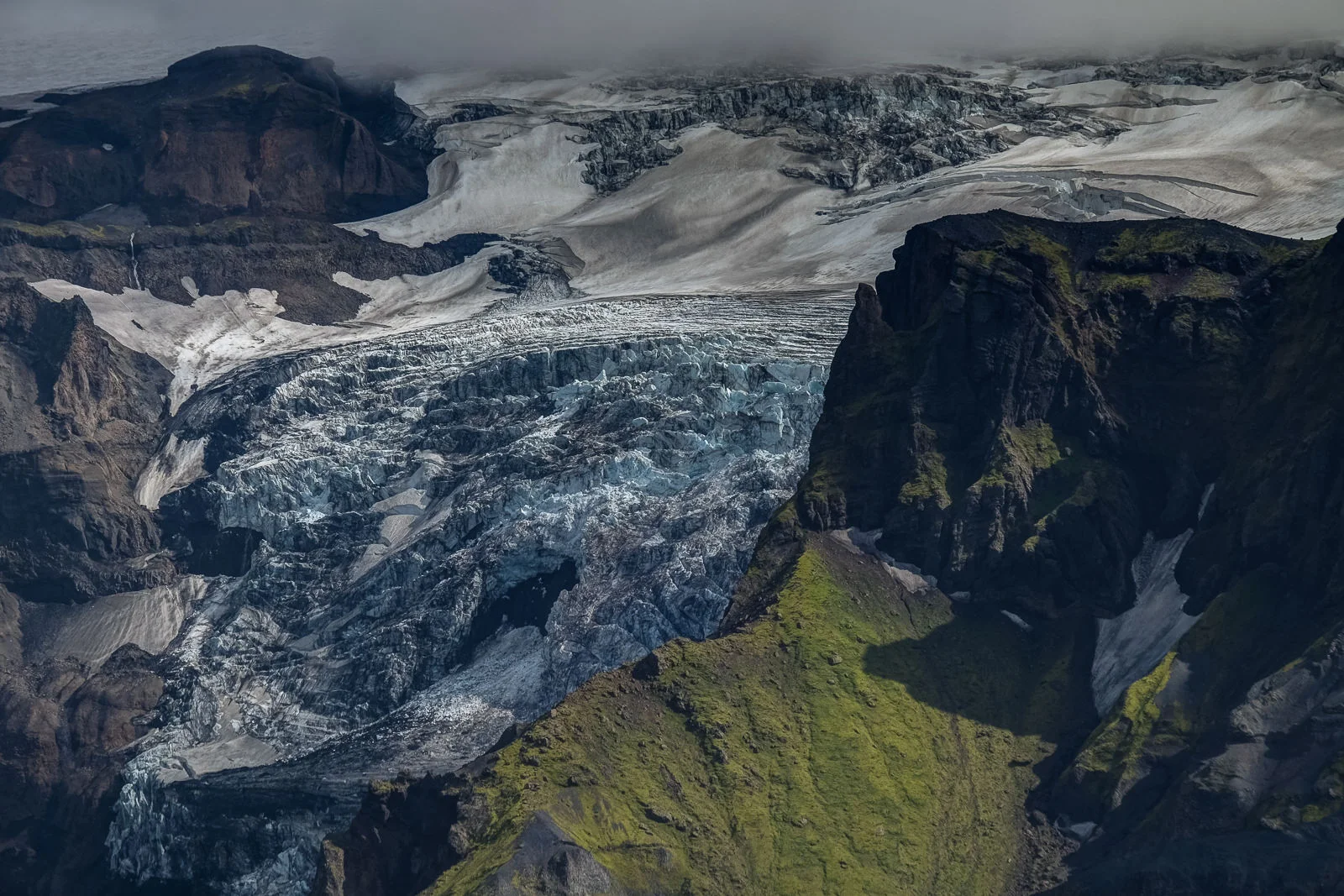 One of the Þórsmörk glaciers under the clouds, the glacier ice folded and scrambled like a frozen image of crashing waves.