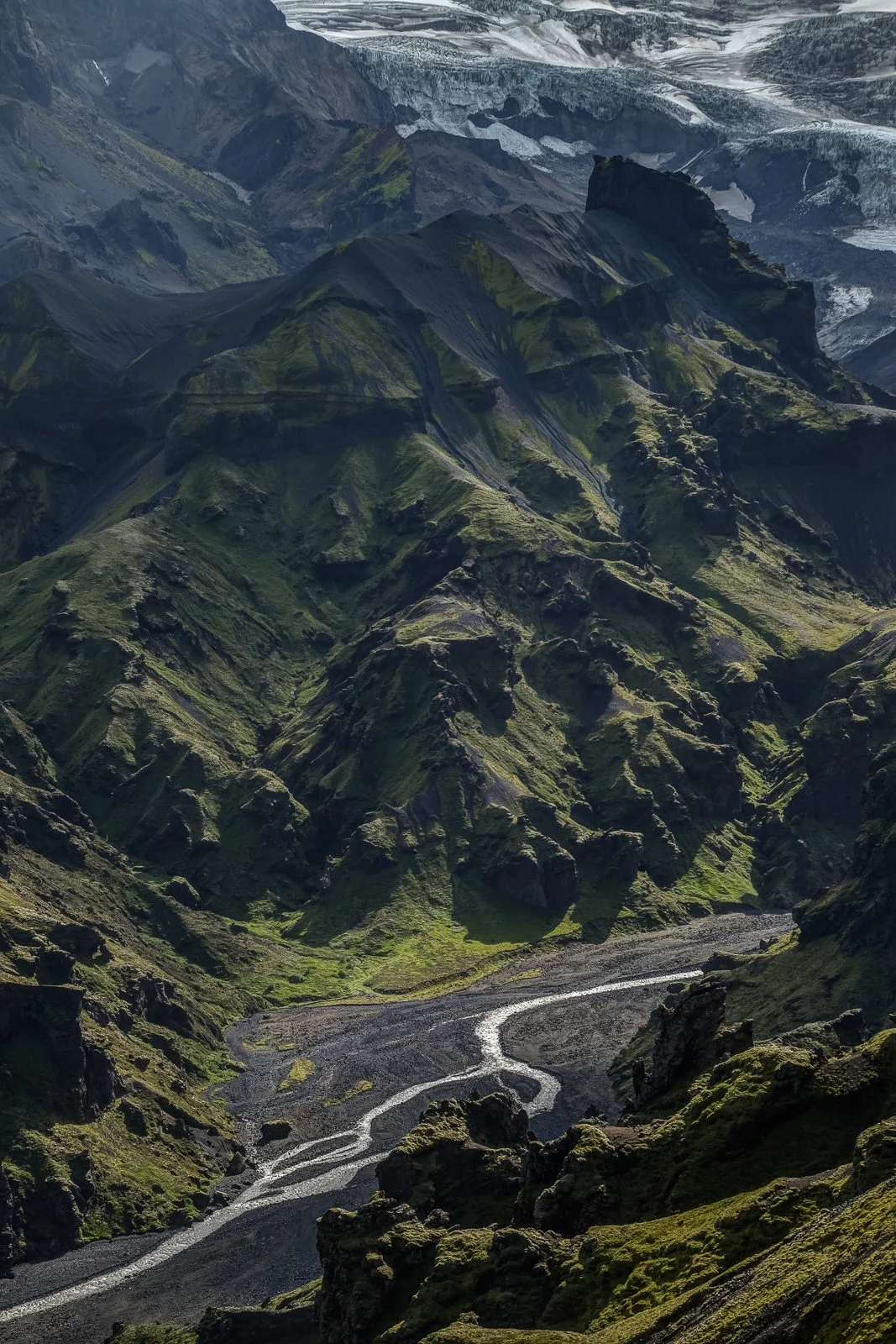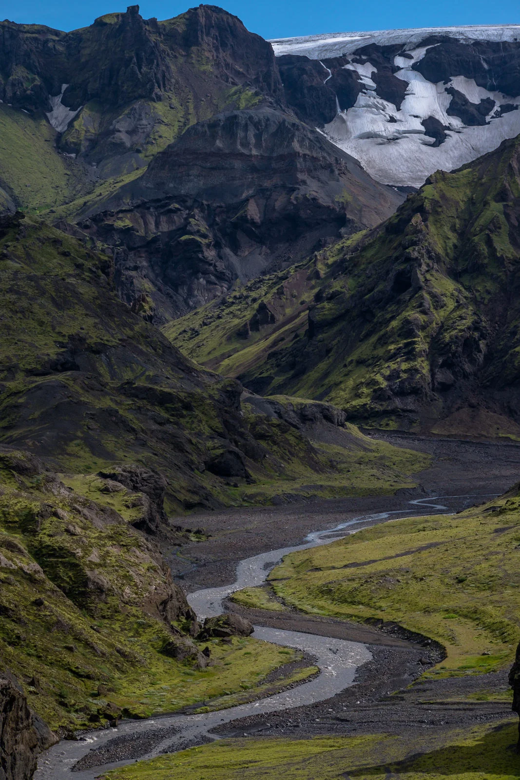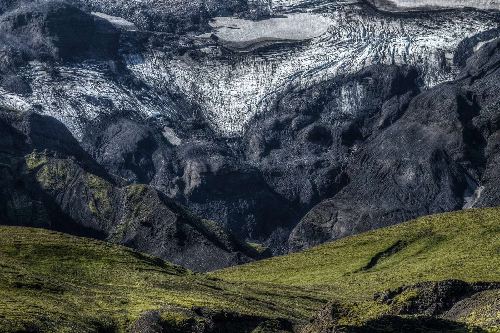 Glacial ice contrasting with the rock of the mountains and the green moss and grass, Þórsmörk