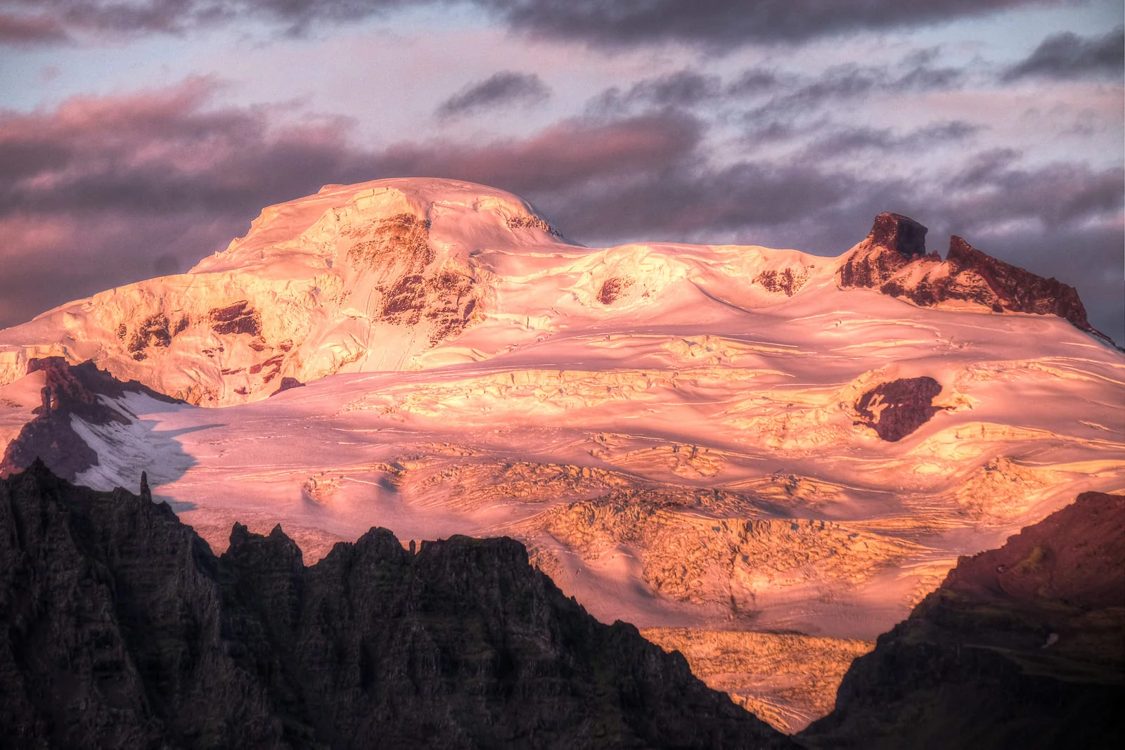 Ice and fire - sunset at Öræfajökull and Hvannadalshnjúkur as seen from Skaftafell.