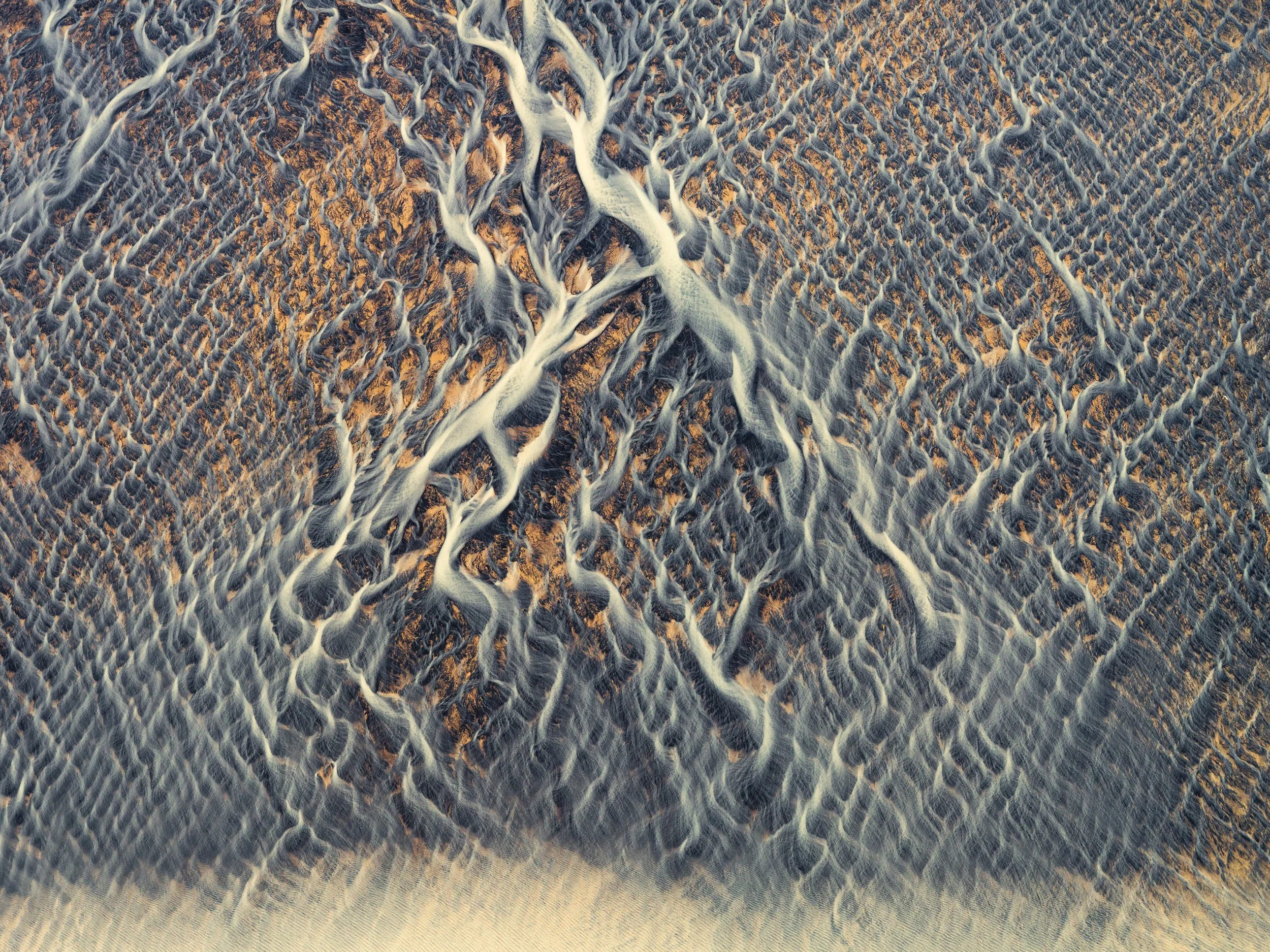 Glacial lace - part of a glacial outwash plain from about 2000ft in the air looks like giant lace weaved with glacial streams. South coast of Iceland.