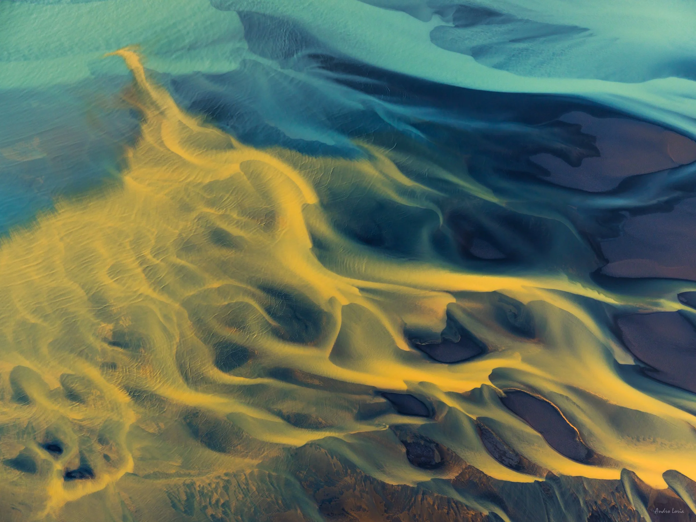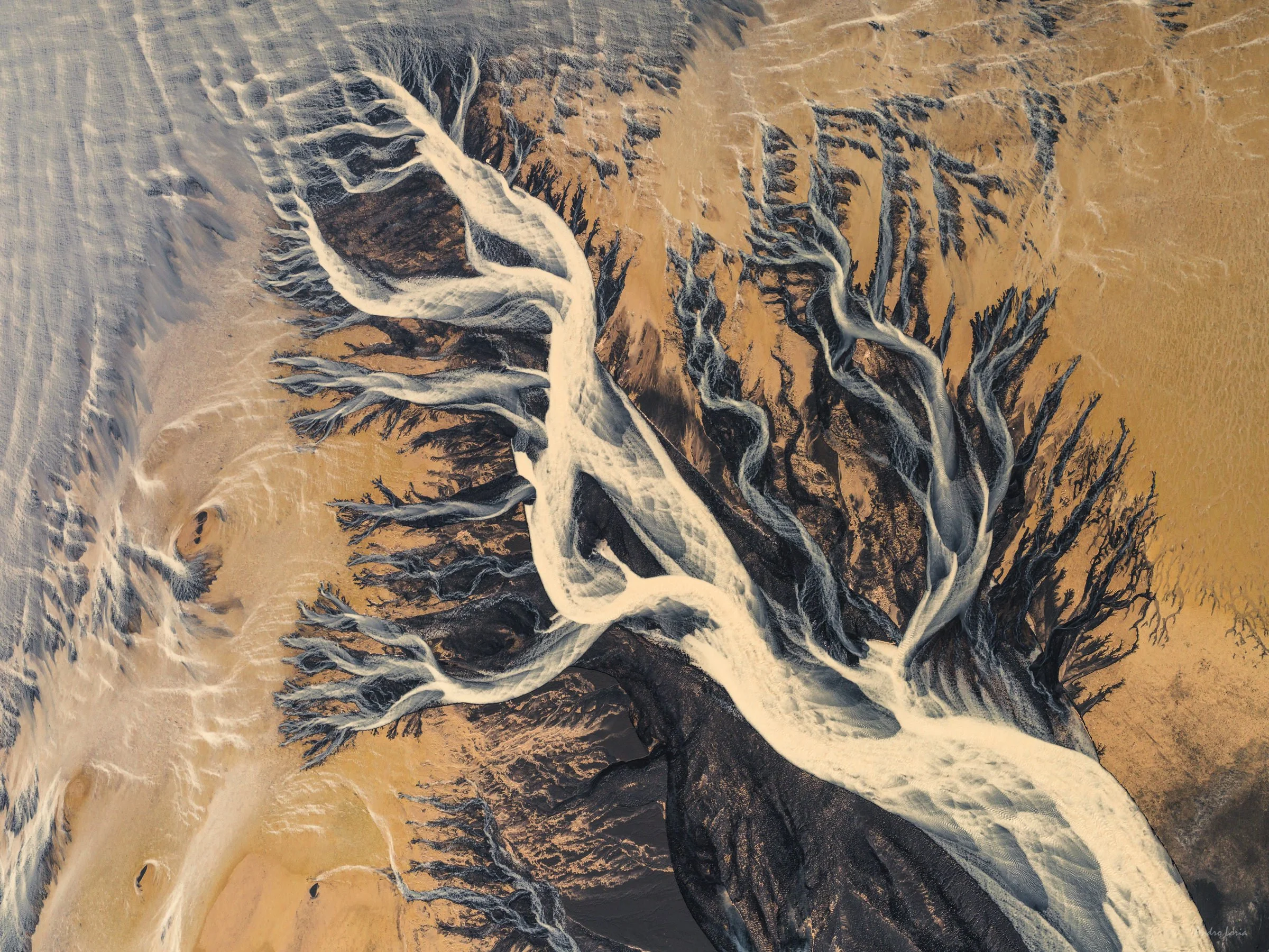 Fractals - silt coloured streams of a glacial river form amazing patterns of giant natural abstract art at the South coast of Iceland.