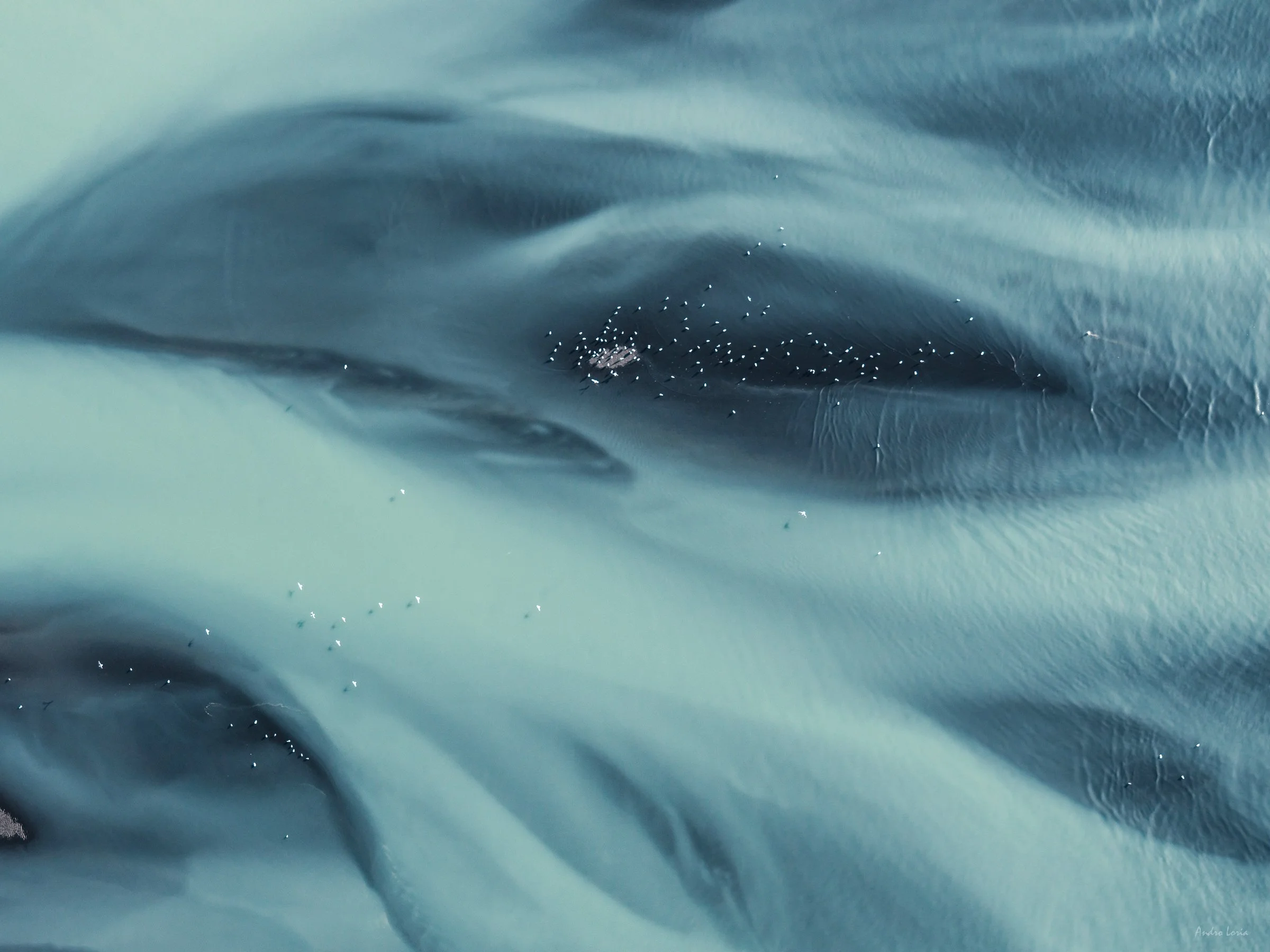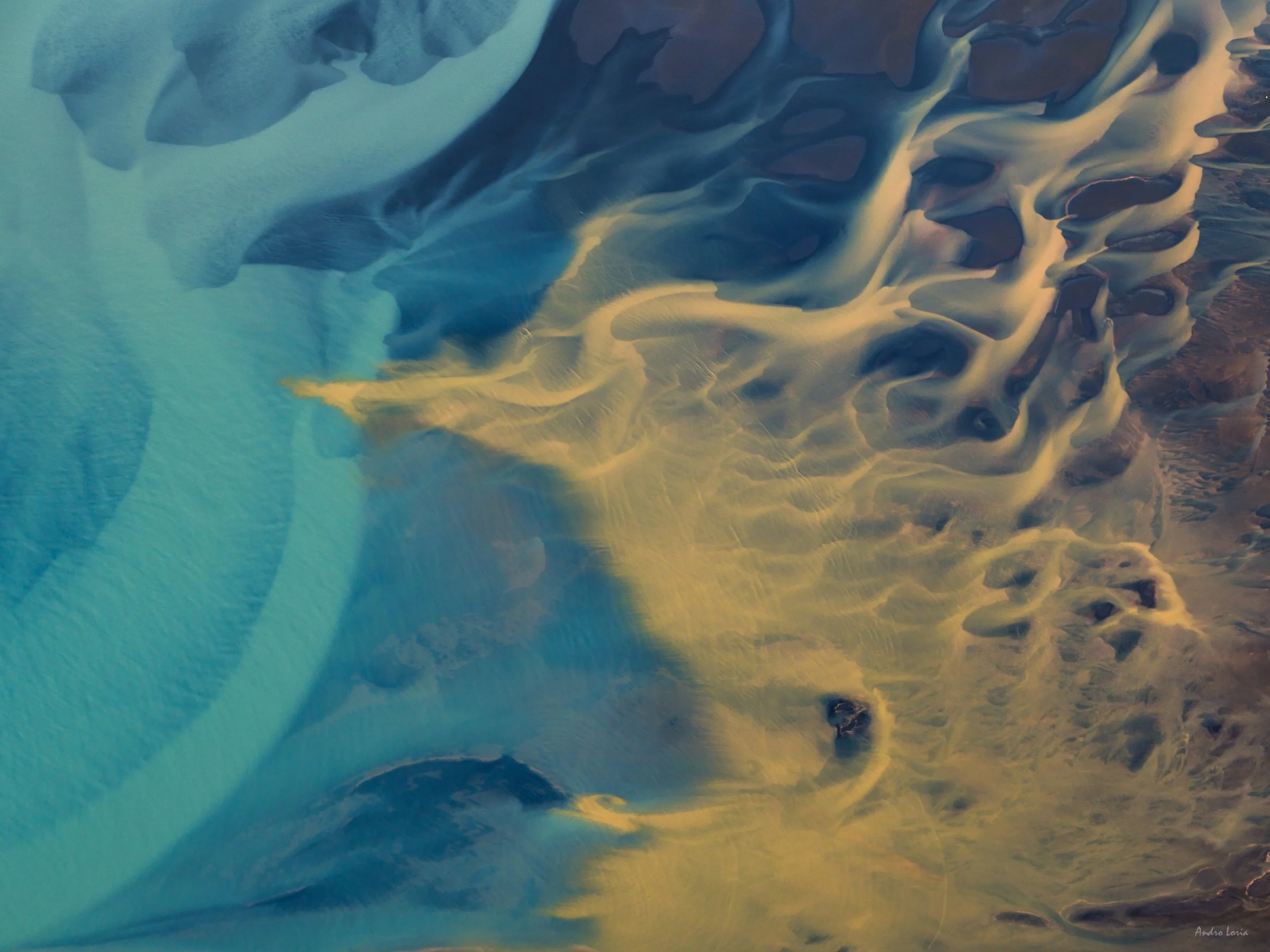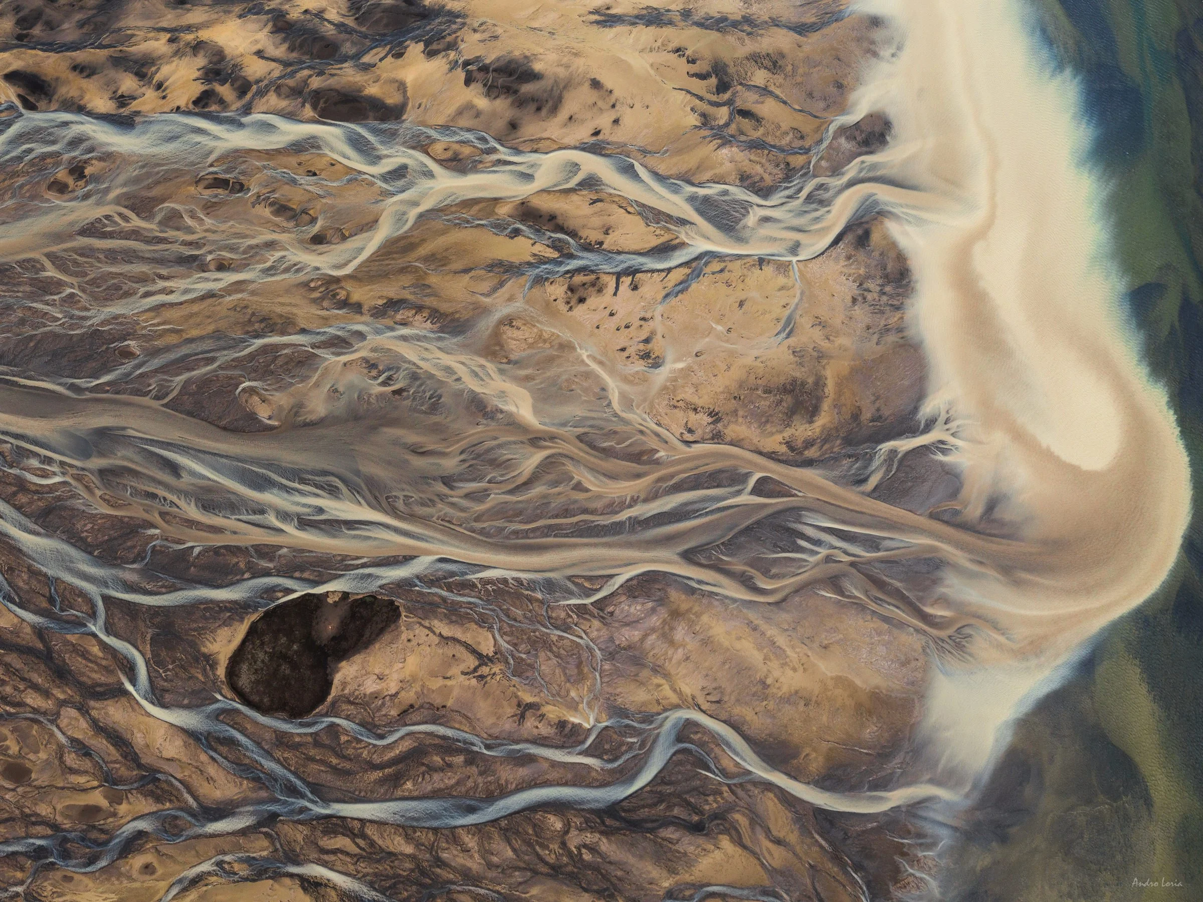Braided rivers - due to rapid and frequent variation of water levels in Icelandic rivers, the amount of water, sand and silt they carry from glaciers towards the ocean, many form amazing, braided structures once they are given enough space (e.g., entering a large area with weak banks after cutting though a canyon) to slow down and form multiple intertwined  channels divided by temporary islands, eyots and bars. Braided rivers, share some morphological features, but also have a distinctive set of unit forms and most of the main rivers can be recognised by their unique patterns of braiding due to the sediment type (and amount) they carry and local landscape through which they flow. Combined with the mentioned above colours given by silt and minerals Icelandic rivers make a unique show, especially when seen from the air as endless patterns of abstract natural art.