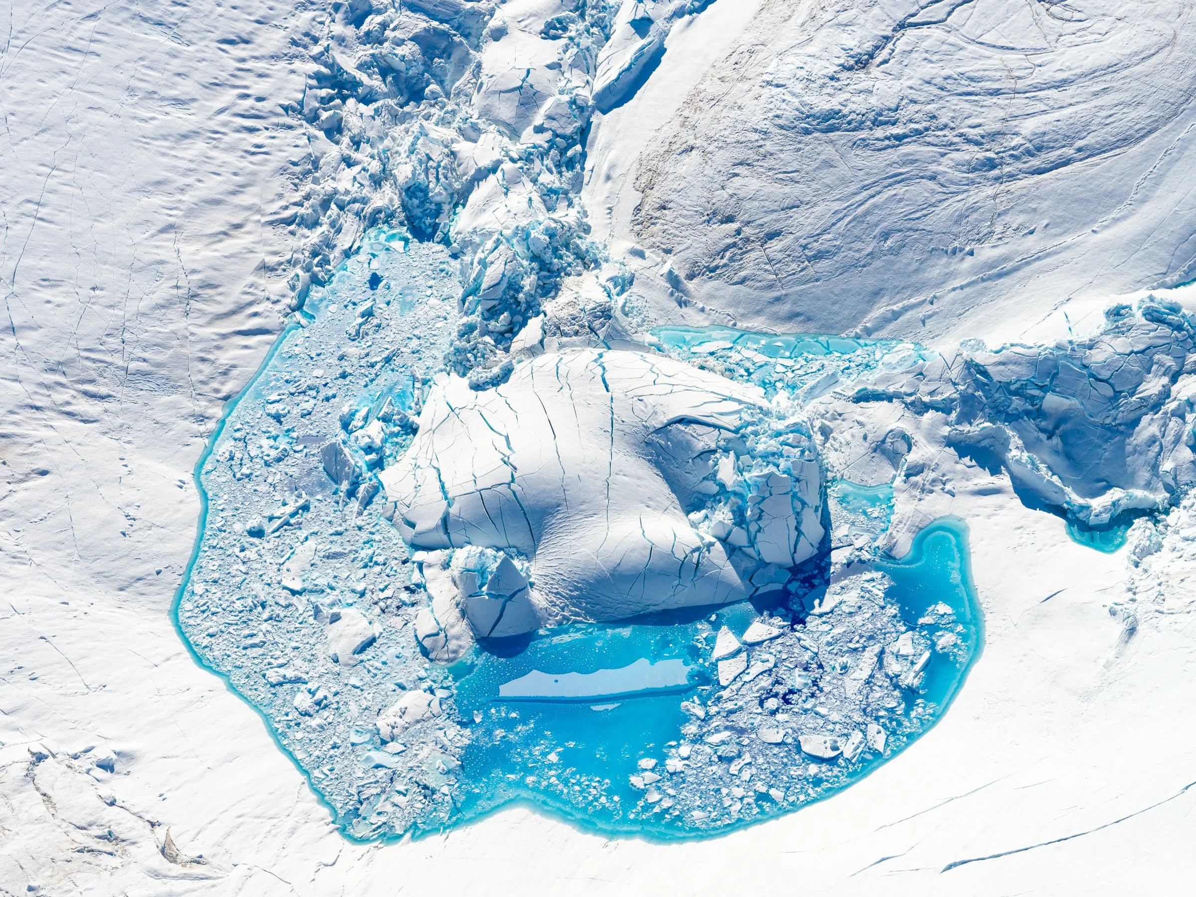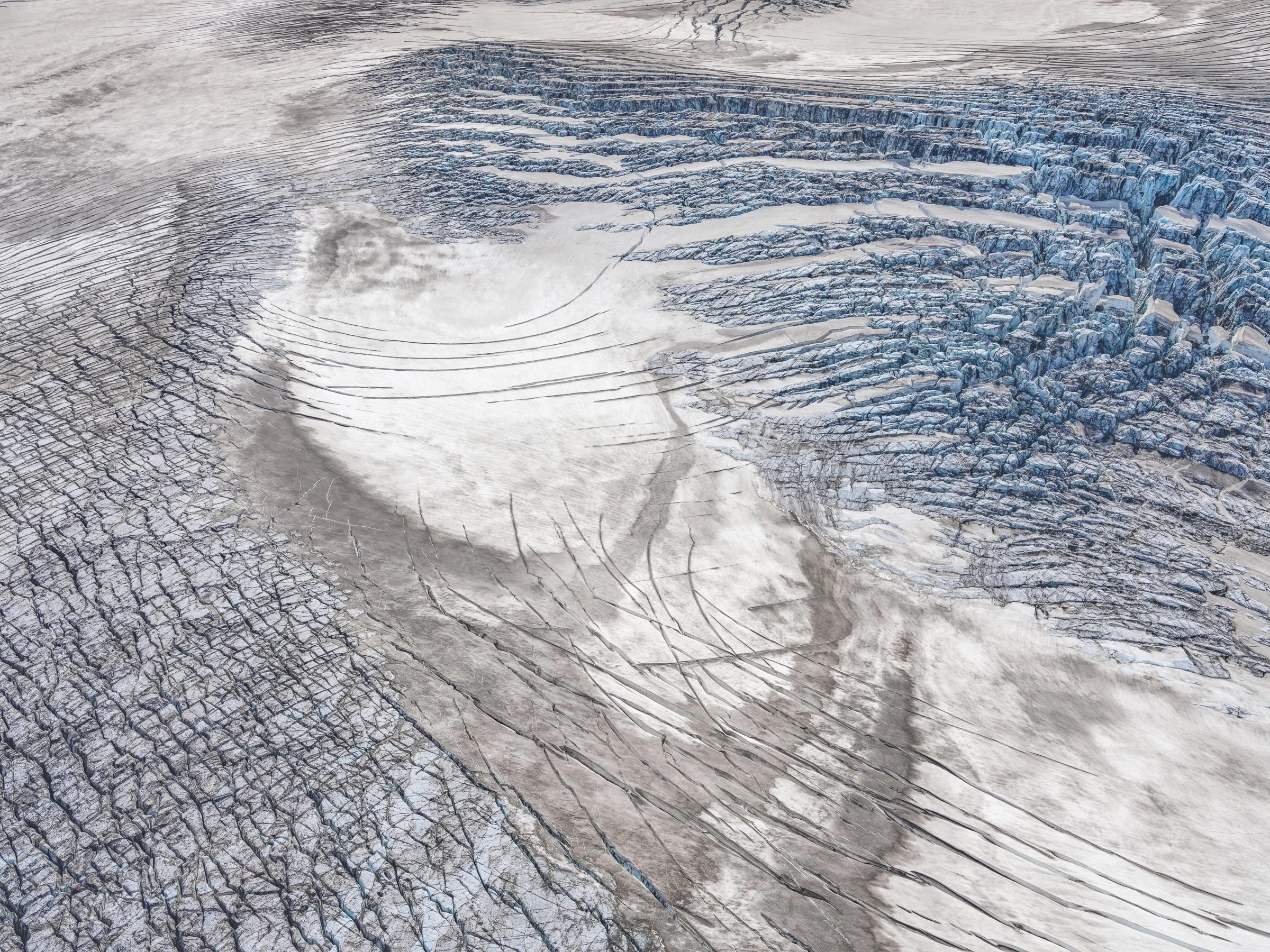 Glacial streams coloured by silt combine into a natural abstract when seen from above.