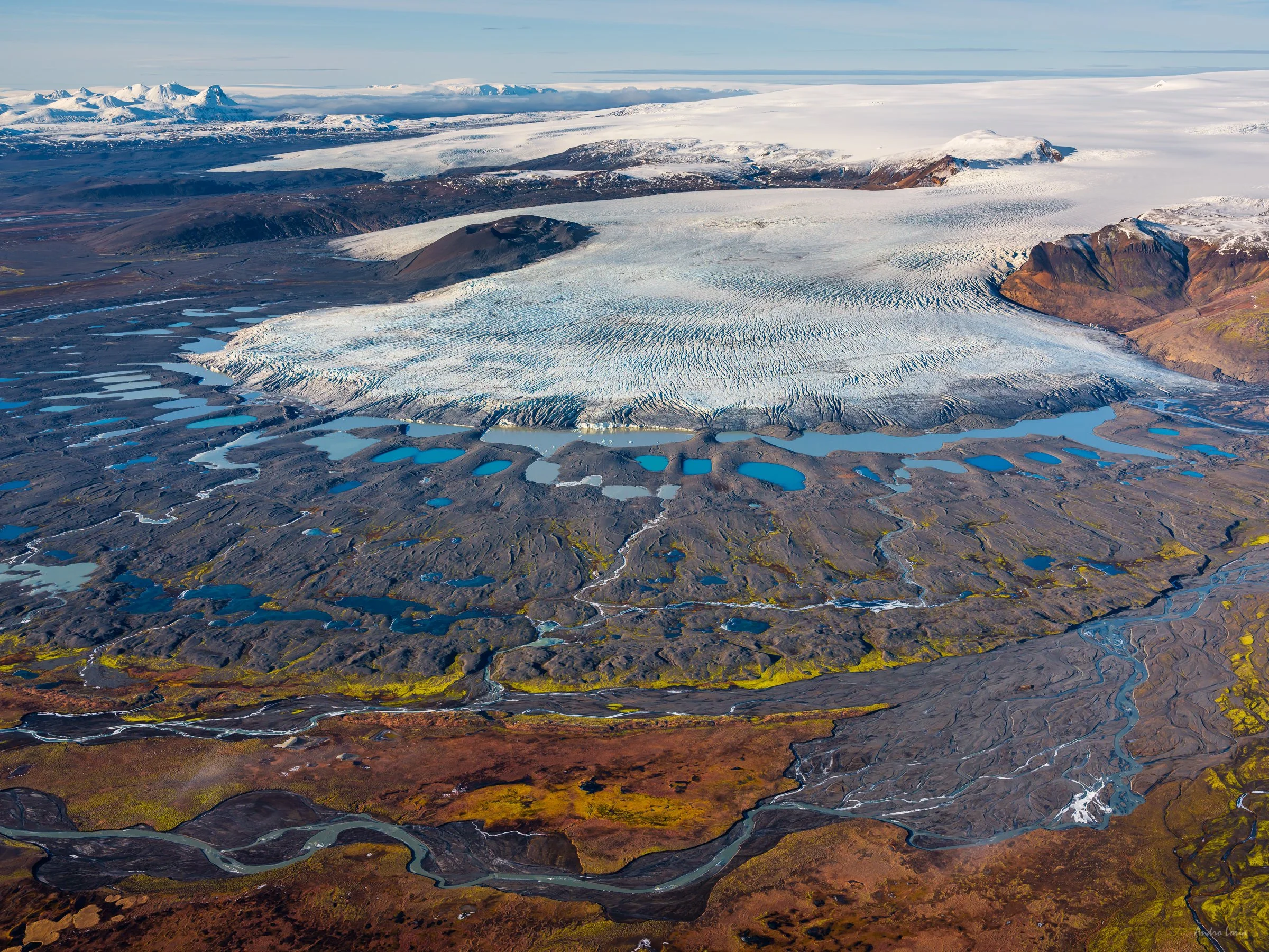 Convergence - three white birds (gulls, centre) show the enormity of glacial streams’ convergence that gives birth to a river at the western edge of Vatnajökull, as seen from above (>1200ft). The streams are coloured by different minerals and silt. Vatnajökull, Iceland,