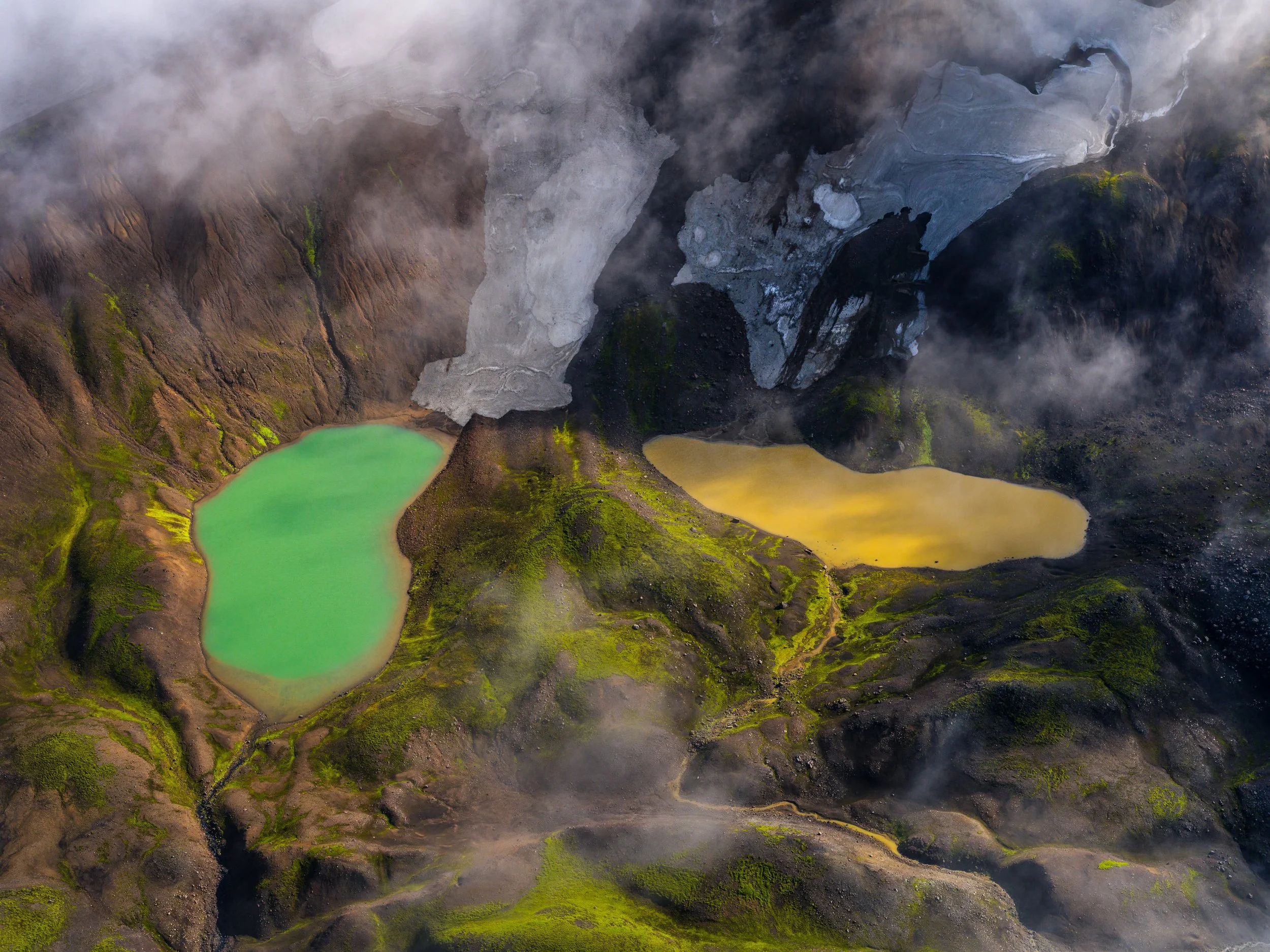 Combination of mineral-coloured rock, streams and moss, all rich in colour after heavy rain, look like abstract art when seen from ~1000ft above. Landmannalaugar.
