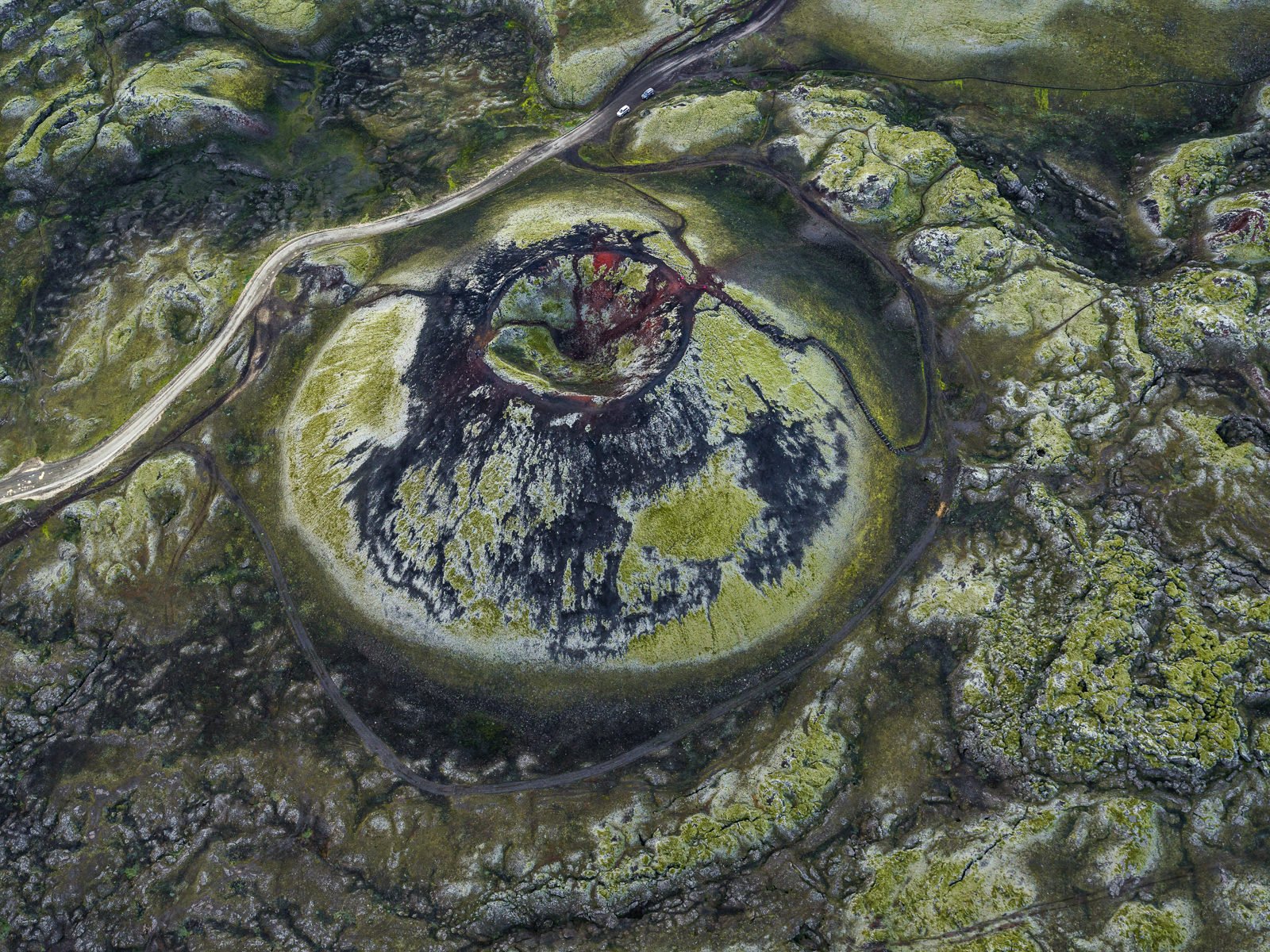 Green moon travel - amazing landscapes of Iceland are best seen from the air. A moss covered old crater looks like it belongs to a different planet or moon. See a couple of 4x4 cars on the road for scale and a couple of people (purple jackets) on the right side of the crater.
