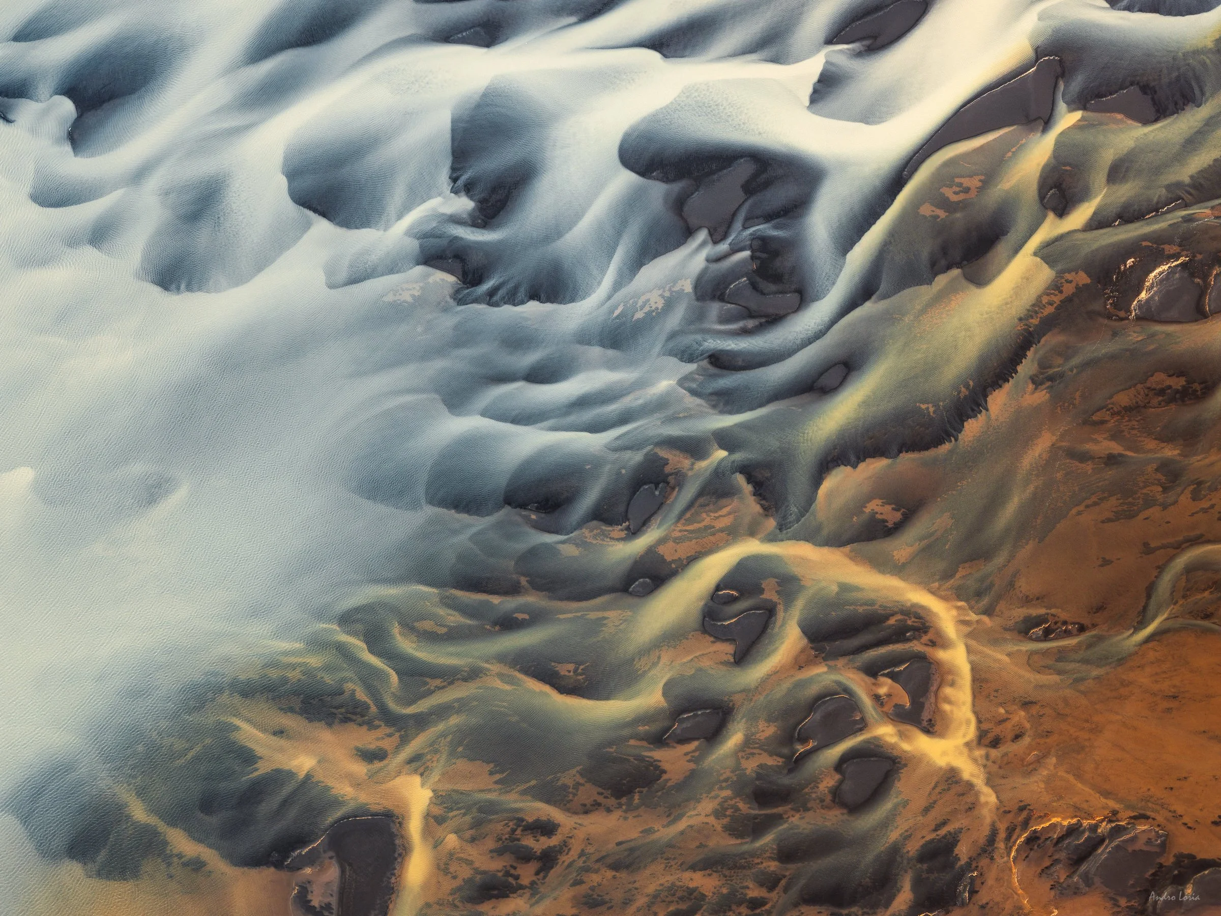 Sunset light adds extra feel to the silt and mineral coloured glacial river streams running from the Langjökull glacier. The river flows to a small lake and in doing so creates some of the best abstract natural art in the world with ever changing patterns and texture when seen from above.